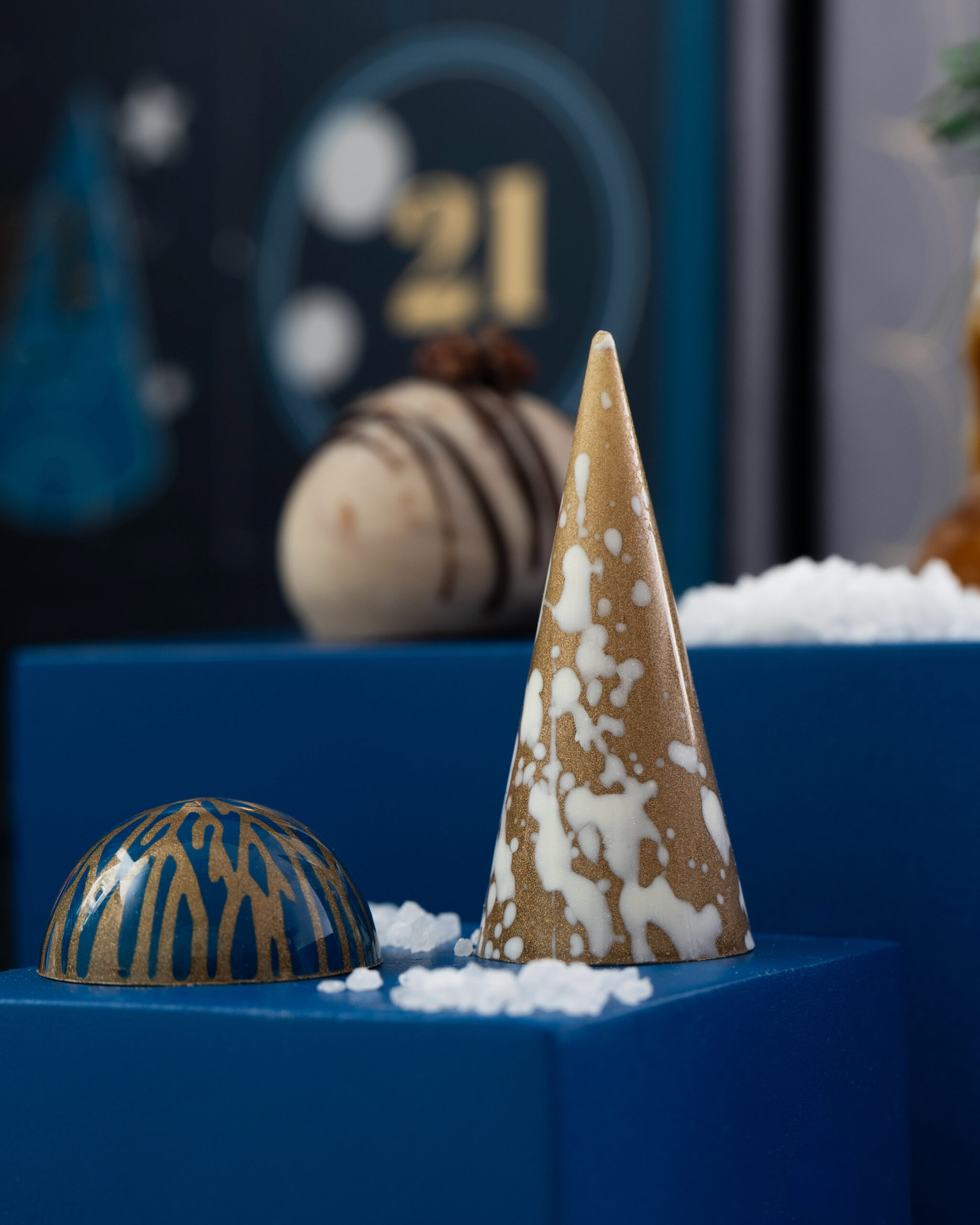 - BOMBON COPO DE NIEVE: de chocolate con leche belga 33.6%, relleno con dulce de leche, pintado a mano con manteca de cacao y detalles oro