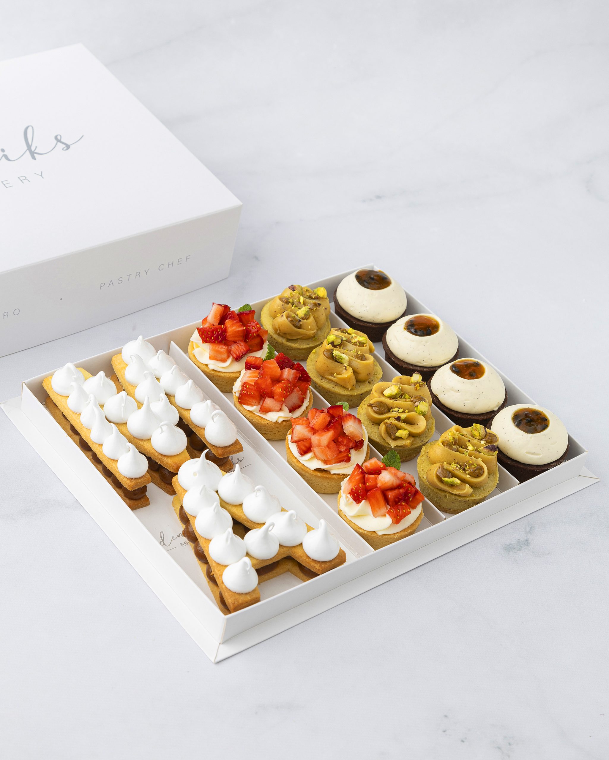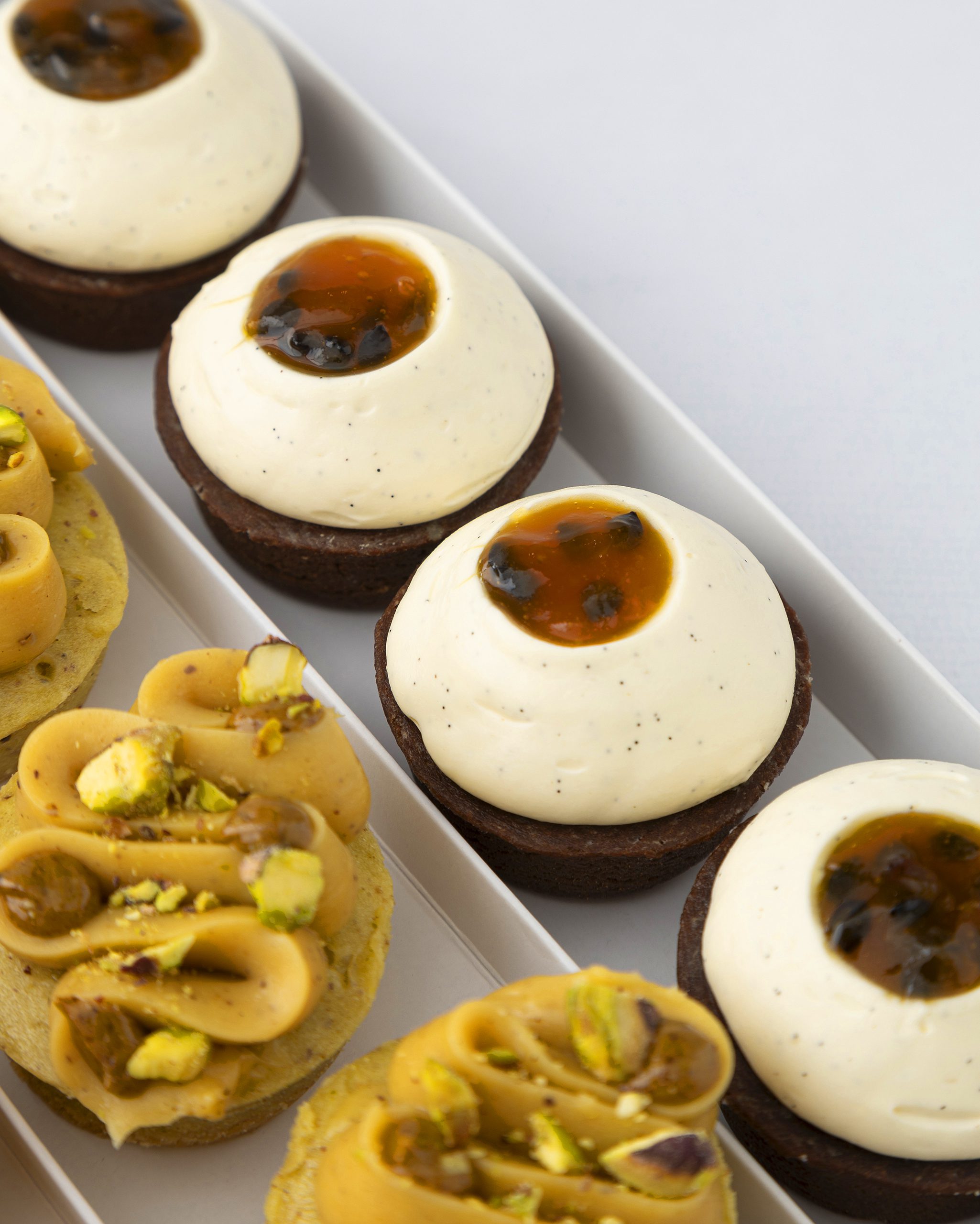 4 Petits Fours maracuya y vainilla (masa sablee de cacao, curd de maracuya , crema de vainilla y reduccion de maracuya)